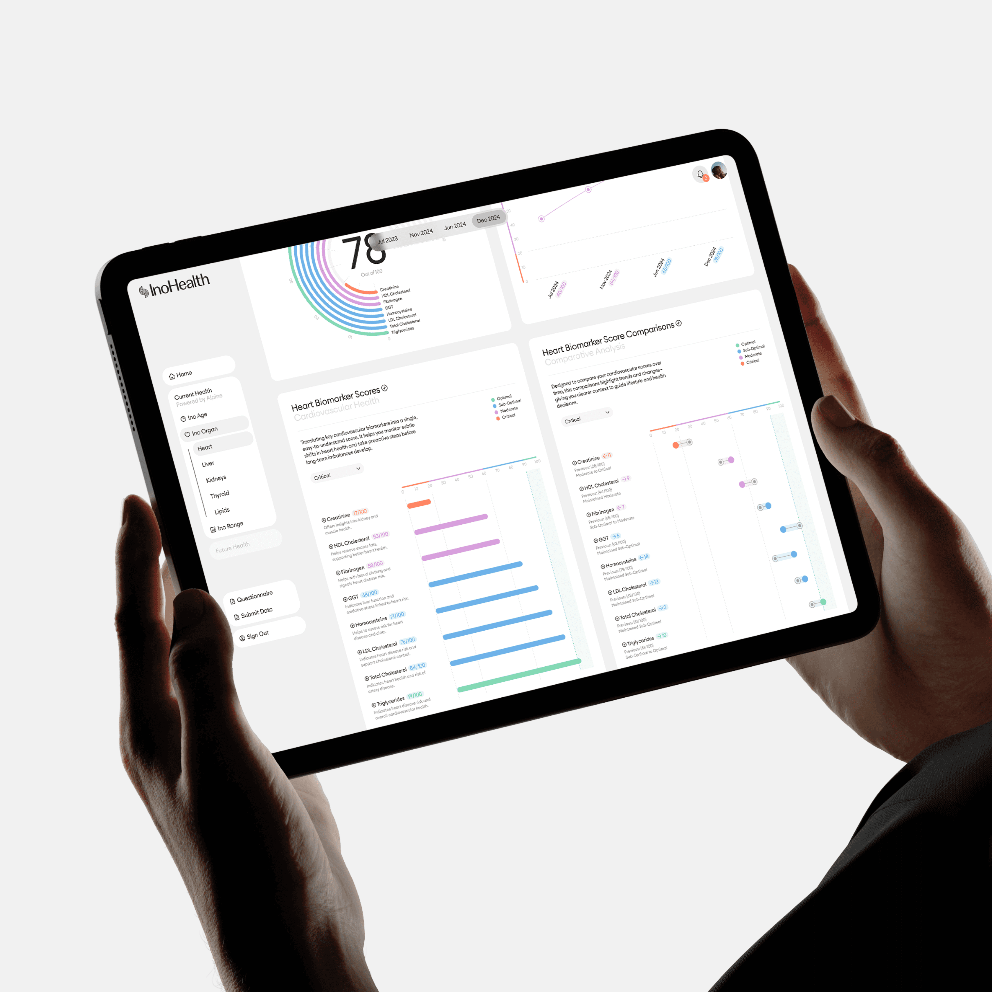 InoHealth offers a new approach to healthcare, combining scientific precision with human understanding. Through clear, intuitive design, it turns complex biomarker data into meaningful insights. Every detail, from its fingerprint-inspired symbol to personalised dashboards—reflects the belief that health is a lifelong, individual journey that empowers people to better understand and manage their wellbeing.